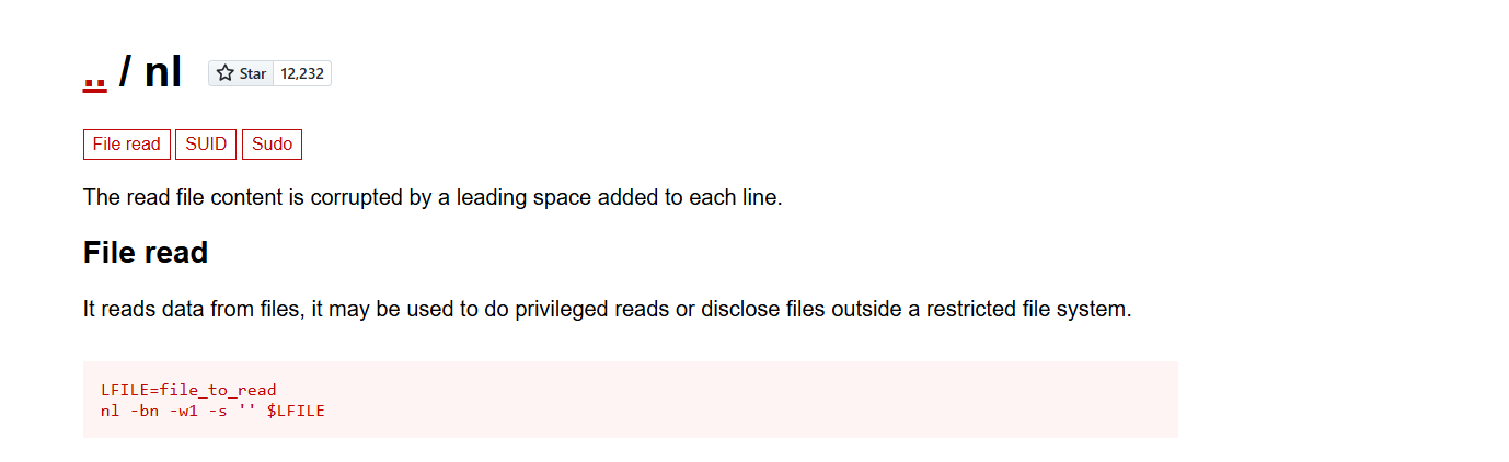 GTFOBins is a resource that documents ways to exploit common binaries for privilege escalation. After checking the list (and resisting the urge to shout “GTFO!”), we find that the nl binary can be used to read files as root.